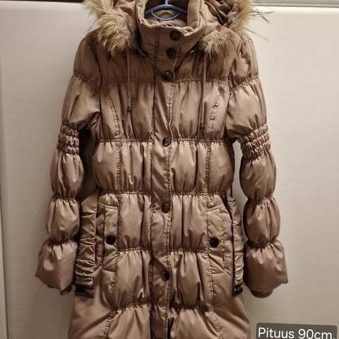 Takin vuoressa höyhentä. Hupussa irroitettava karvareunus. Takin päältä mitattuna kainalosta kainaloon noin 55 cm ja koko pituus noin 90 cm.