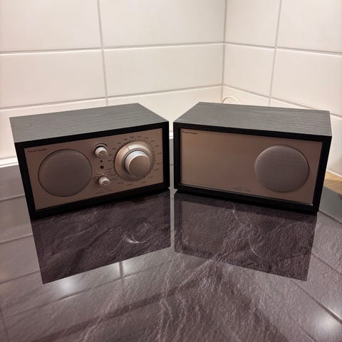 Hyvä- ääninen Bluetooth, wifi, kaapeli ym. kaiutin. Tyylikäs ulkomuoto, puukotelo.