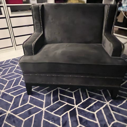 Skannon Kameleontti nojatuoli, musta, sisustusarkkitehti Torsten "Totti" Laakson suunnittelema, ajan kulutuksen näkymiä käsinojissa, nykyinen sininen verhoilu erittäin hyvässä kunnossa, molemmat tyynyt voi käyttää molemmin puolin. Tuoli valmistettu erikoistilauksesta, koska Kameleontteja valmistettiin vain sohvina. Nouto Leppävaaran Leirikadulta.