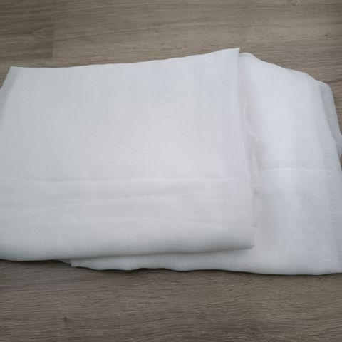 Valkoiset ohuet verhot. Kevyt, läpikuultava kangas sopii esimerkiksi sängyn ympärille, huoneen jakajaksi tai ikkunaverhoksi. Löytyy Sopenkorvesta.