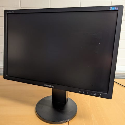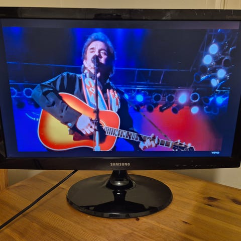 Samsung 24" näyttö/TV valkoisella rungolla. Takana useita liitäntöjä, kuten VGA ja AV-sisääntulot, jotka soveltuvat esimerkiksi tietokoneen tai muiden laitteiden kytkemiseen. Näyttö sopii yleiskäyttöön, kuten työpöytänäytöksi tai viihdekäyttöön. Mukana kuvassa näkyvä virtajohto ja kaukosäädin.