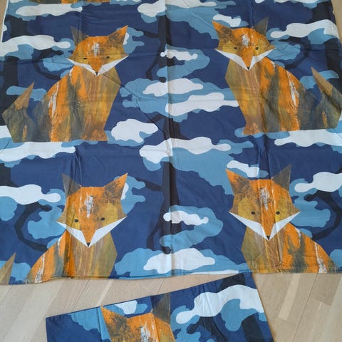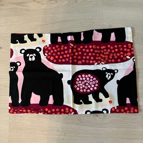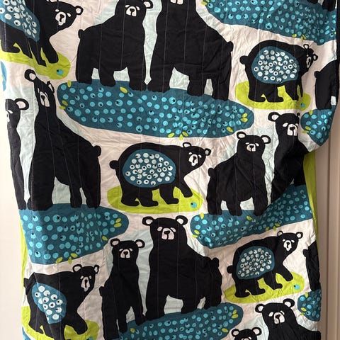 Kaksi (2) kpl Finlayson lasten ja aikuisten mukaan otettavia unipusseja, jossa karhukuvioinen kuosi sinisen, valkoisen ja vihreän sävyissä. Toisella puolella yksivärinen vihreä pinta.