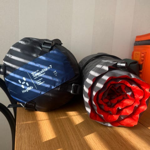 Retki makuupussi, tyyny ja lakana, ei käytetty.