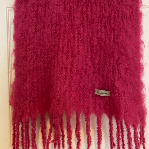 Myydään vaaleanpunainen Balmuir Aurora kid mohair -huivi. Huivia on huollettu Balmuirin omalla mohair-harjalla, joten se on säilyttänyt pehmeytensä eikä mohairvilla ole päässyt huovuttumaan.