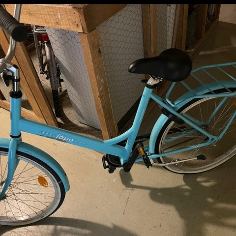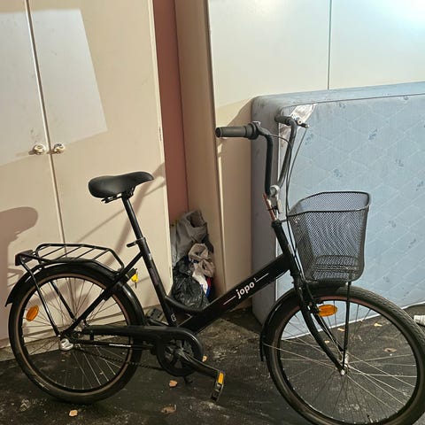 Jopo kaupunkipyörä 24". Pyörässä on 24 tuuman renkaat, korkea ohjaustanko ja matala runko, joka helpottaa kyytiin nousemista. Väriltään pyörä on musta, vaaleilla renkaiden sivuilla. Sopii kaupunkiajoon ja lyhyille matkoille tasaisilla alustoilla. Pyörässä on perinteinen satula ja polkimet VAIN NOUTO!