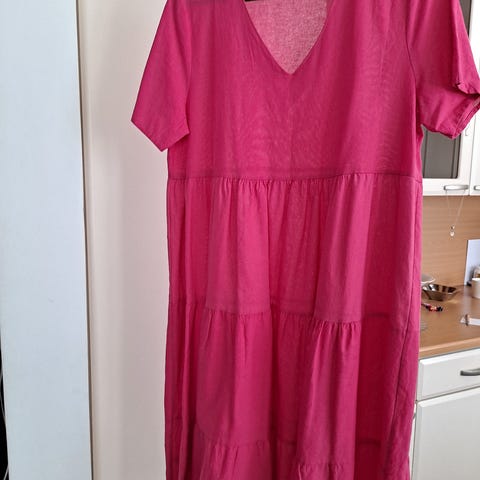 Vaalea lila, napit aukeaa ihan alas, joten menee myös kesällä takkina neuleen sijaan. Ei vuorta, ei näy läpi. Takana vyötäröllä kuminauha ja myös hihansuissa.