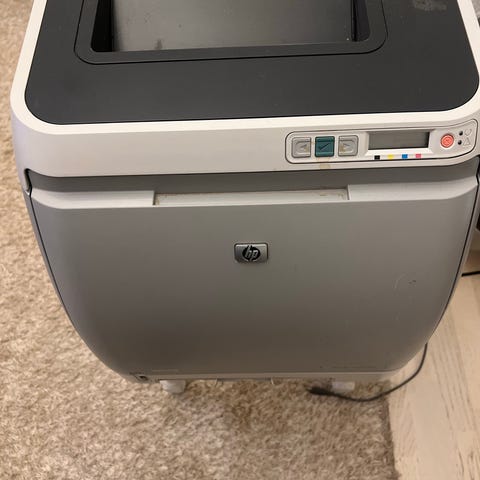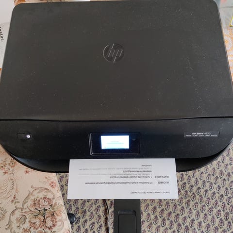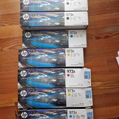 HP MFP P57750dw tulostin, mustekasetit 973 kuvan mukaan, 4 avattu, mutta käyttämättä. Tulostin vaatii luultavasti korjausta. Manuaali PDF muodossa.