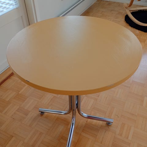 siistikuntoinen kevyt rakenteinen pöytä. 100cm halkaisija 72cm korkeus.