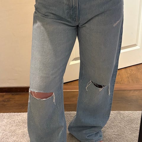 Bershka vaaleat farkut. Koko L. Hajonneet hiukan reunasta, vaatii korjausta muuten hyvässä kunnossa..joustaa.