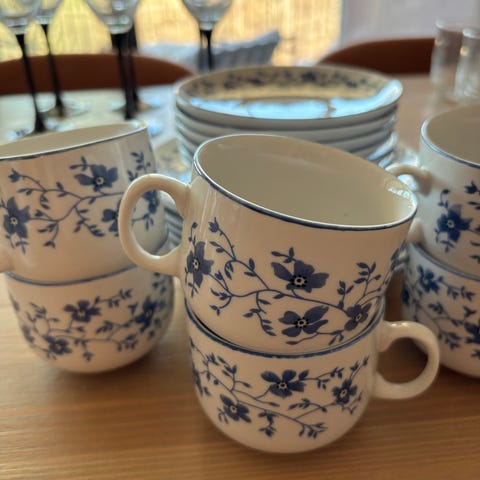 Valkoiset, posliiniset kahvikupit ja tassit. 22 kappaletta. Tästä edullisesti kahvikupit kesän juhliin. Tavaraa ja astioita; kakkulautaset, ruokalautaset, syvät lautaset, juomalasit yms. on paljon. Kysy lainaksi tai osta omaksi.
