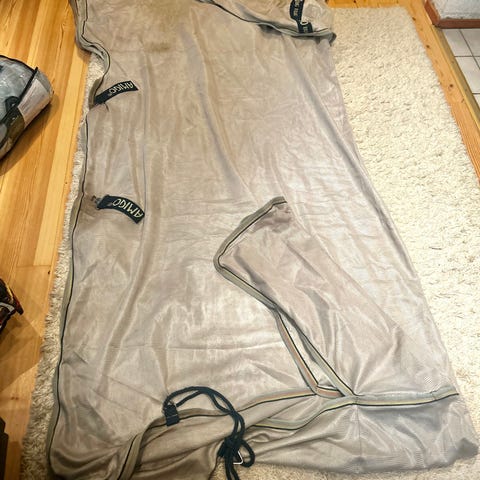 Isolle hevoselle tarkoitettu hyönteisloimi, joka suojaa myös uv-säteiltä. Muuten aivan priimakunnossa, mutta häntäläpän vieressä pieni repeämä. Kaulakappale, vatsaläppä kolmella vyöllä sekä pitkä häntäsuoja. Pitkät helmat, hyvin muotoiltu. Ovh n. 140€