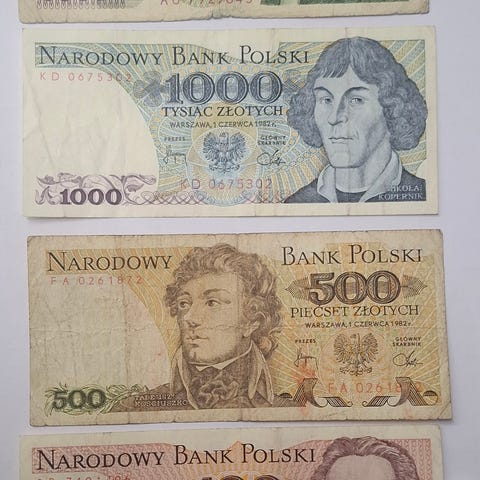 Puolan valuutan setelit, nimellisarvot 20, 50 ja 100 zlotya. Seteleissä on eri historiallisia henkilöitä ja symboleja sekä tekstit Narodowy Bank Polski ja Rzeczpospolita Ludowa. Sopivat esimerkiksi keräilyyn tai rekvisiittakäyttöön. Setelit myydään yhtenä eränä kuvan mukaisina.