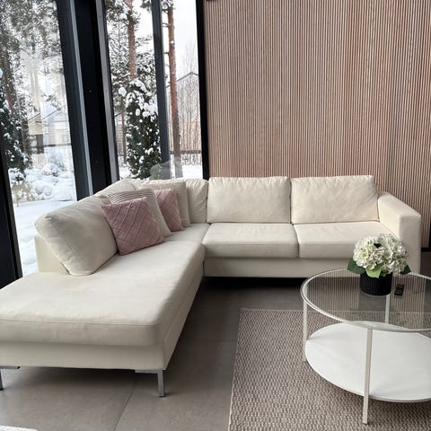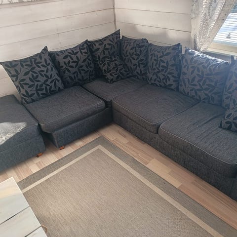 Harmaa Bellus kulmasohva. Tyynyistä irrotettavat päälliset.