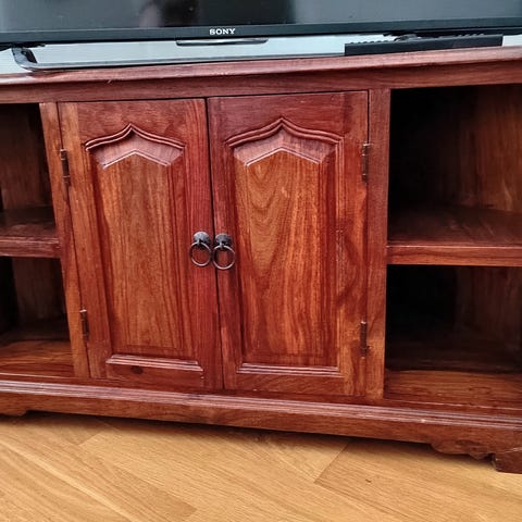 Kulmakaappi - lipasto lakattua mäntyä. Kaapissa on avohylly sekä kaksi vetolaatikkoa metallivetimillä. Sopii esimerkiksi yöpöydäksi tai tv- tai mediatasoksi tai säilytyskalusteeksi nurkkaan sijoitettuna.