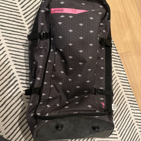 Sisältä siisti, puhdas ja hajuton! Ulkopuolella käytönjälkeä. 4 pyörää täysinnehjät kuten vetokahvakin. Laukku tyhjänä hyvin kevyt. Mukaan lukko jota en ole koskaan käyttänyt.