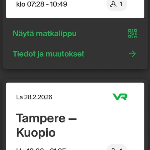 Tuli muutoksia matkalle lähtöön. Joten myyn lippuni eläkeläiselle tai yli 65-vuotiaalle. Kuopio- Tikkurila-Malmi. Lipulla voi mennä Helsingin juna-asemalle saakka.