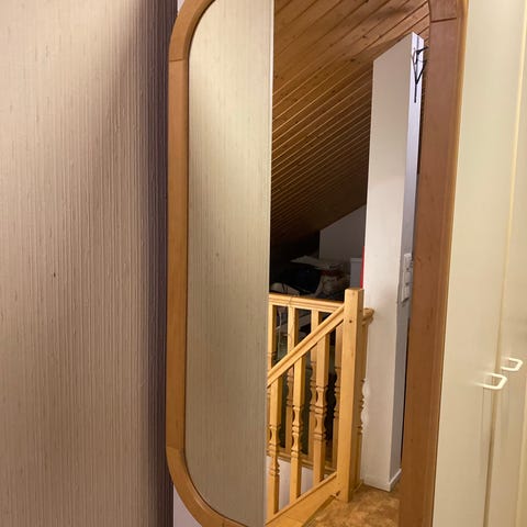 Finnmirror peili, jossa suorakulmainen muoto ja puinen ylä- ja alareuna. 40 x 102 cm. Vuosimalli 1982. Eli ikään nähden hyväkuntoinen. Muutama pieni naarmu.