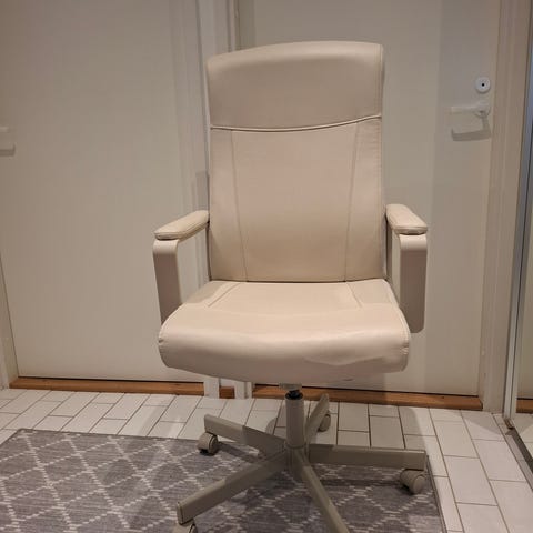 Myydään IKEAn Fjällberget kokoustuoli. Ollut osa kotitaloutta kaksi vuotta, mutta vähällä käytöllä vanhempainvapaiden takia. Vaaleaksi petsattu tammiviilu, pyörät alla. Istuinosa 40x42 cm, jalkojen leveys 71cm.