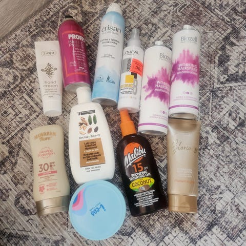Sekalainen kosmetiikkapakkaus, jossa on erilaisia ihon- ja hiustenhoitotuotteita.