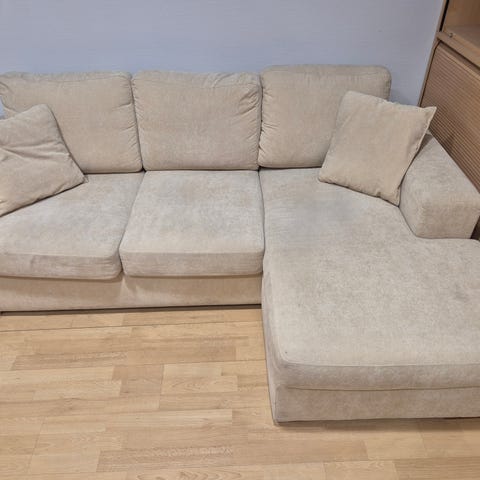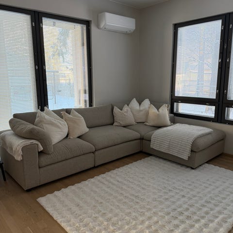 Muhkea puoli vuotta vanha harmahtava beige sohva ja rahi