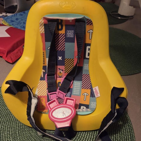 Baby Born polkupyörän turvaistuin nukelle. Keltainen istuin, jossa turvavyöt ja kiinnitysremmit polkupyörään. Tarkoitettu Baby Born -nukelle tai samankokoisille nukeille leikkikäyttöön.