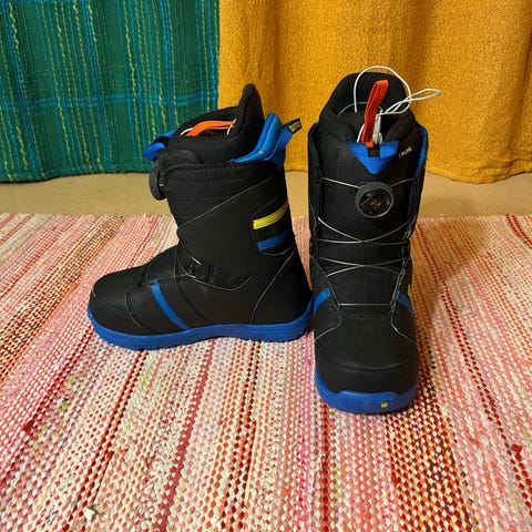 Burton Zipline Boa lasten lumilautakengät. Kengissä on Boa-kiristysjärjestelmä, joka mahdollistaa helpon ja tasaisen kiristyksen säätämisen. Koko on EU 38 (US 5, 24 cm). Väritys on harmaa mustilla ja vaaleakuvioisilla yksityiskohdilla. Pohjissa on kuviointi, joka parantaa pitoa lumella. Sopivat lasten lumilautailuun rinteessä ja harjoitteluun. Kengät on suunniteltu käytettäväksi lumilaudan siteiden kanssa.