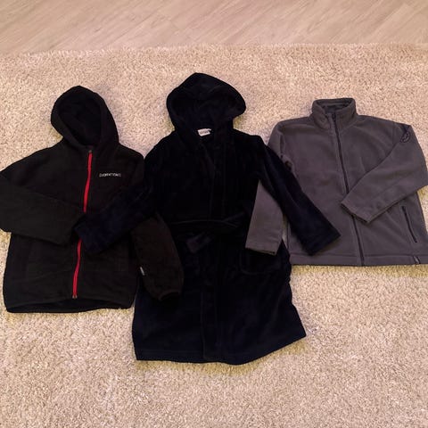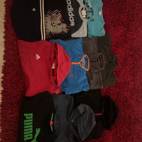 Verkkarit 128 cm, House avaruuspyjama 130 cm, kaksi pipoa, yksi uusi pitkähihainen autopaita 140 cm, yksi Joe Boxer pyjamapaita 130 cm, lyhythihaisia 6 kpl koossa 134-140 cm (toisessa kuvassa esillä paremmin) enemmän ja vähemmän käytettyjä lyhythihaisia poikien paitoja, Lindex, Peuhu, Ciraf, House ja pari Ropsin paitaa