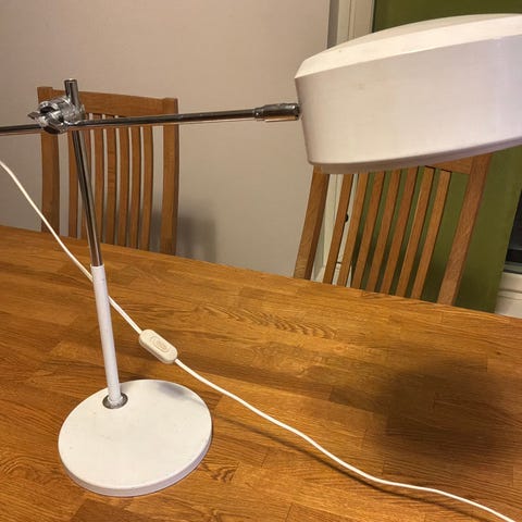 Myyn hyväkuntoisen lähes käyttämättömän pöytävalaisimen taittuvalla varrella. Valaisimessa on pieni loisteputki, jossa on kaksi vierekkäistä putkea kiinni toisissaan. Sähkö tulee toisesta päästä. Sopii hyvin opiskelijalle tai muuhun vastaavaan käyttöön. Loisteputken tilalle löytyy ehkä myös led-polttimo.
