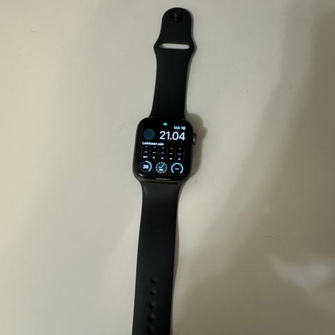 Paljon pidetty, mutta vielä hyvässä kunnossa oleva Apple watch älykello. Pieniä naarmuja näytössä, mutta muuten täysin ehjä ja toimiva. Akun kunto on 84% mikä kestää oikein aktiivisella käytöllä noin vuorokauden. Tästä hyvä esimerkiksi ensimmäinen älykello kokeiluun.