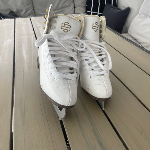 Spin taitoluistimet, koko 36. Valkoiset nauhalliset luistimet, joissa tekoturkisreunus varren suussa.