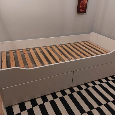 Ostettu Hobby Hallista noin kaksi vuotta sitten, mutta sitä ei enää valmisteta. 90x200, en ole varma korkeudesta, koska se on purettu osiin. En saanut fyysisiä kuvia, koska se on varastossa. Myyn, koska ostin tyttärelleni uuden sängyn. Hinta on neuvoteltavissa, sillä se ostettiin uutena hintaan 324,99.
