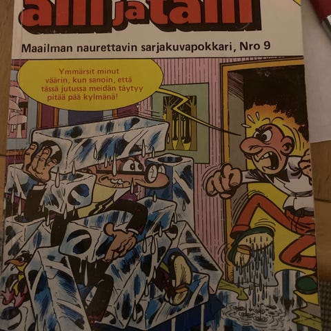 Vanhoja Älli ja Tälli sarjakuvalehdet, kaksi kappaletta. Kansiotsikot: "Älli ja Tälli ja mammuttijäätikön salainen arvoitus" sekä "Älli ja Tälli – Missä miljoona?".