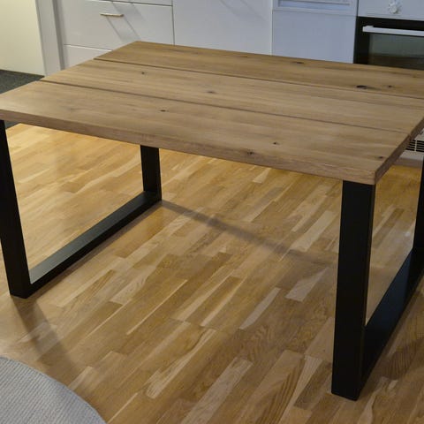 Kuuden hengen ruokapöytä paksusta lankusta, todella tukeva (ja raskas) pöytä. Mustat metallijalat.