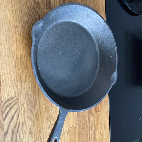 Hyvässä kunnossa oleva vanha valurautainen lättypannu.