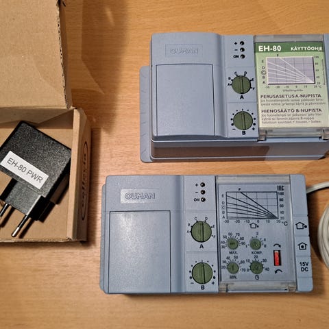 Ouman EH-80 ohjainlaite lämmitysjärjestelmän säätöön. Laitteessa on kaksi säätönuppia (A ja B) sekä käyttöohjeet ja käyrä etupaneelissa. Syöttöjännite 15V DC. Mukana useita kaapeleita liitäntöjä varten. Sopii lämmityksen ohjaukseen ja säätöön järjestelmissä, joissa käytetään Ouman EH-80 -tyyppistä ohjausta.