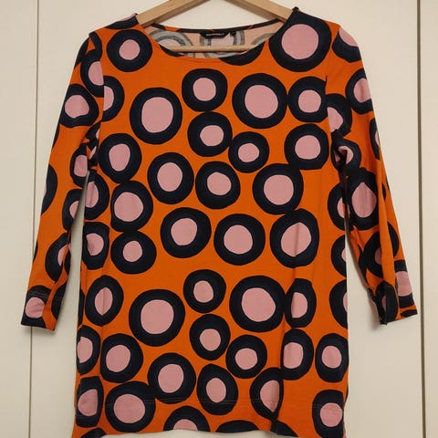 Marimekon Sinea Apajat Placement -paita, koko M/38. Paksua trikoota, 96 % puuvillaa , 4 % elastaania, boxy fit. Kai-kai 51 cm, pituus 60 cm. Takana alhaalla minimaalinen musta jälki (kuva), joka ei näy kauempaa katsottuna. Kuosi Antti Kekki 2021 ”Apajat”.