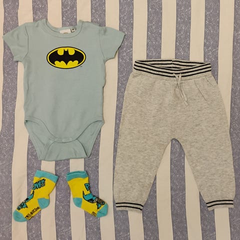 Myydään söpö H&M n Batman setti vauvalle. Setissä body, housut ja myssy. Koko 68.
