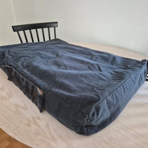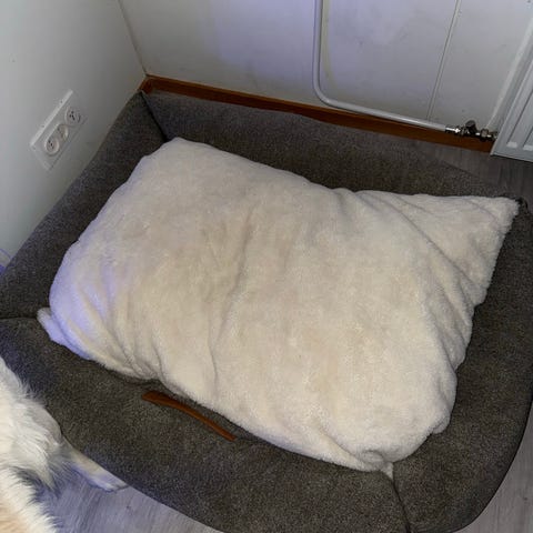 Harmaa 115cm pitkä ortopedinen koiranpeti, jossa on korkeat reunat kolmella sivulla. Pedissä on erillinen vaalea, pehmeä alusta, joka voidaan asettaa pohjalle lisämukavuutta varten. Alustasta on lähtenyt muutama tarra irti. Sisällä memory foam patja, sopii siis hyvin nivelrikkoisille koirille.