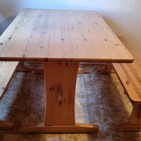 Upea kuvan pirttipöytä myytävänä. Kunto hyvä. Runko erittäin tukeva. Ajan tuomia jälkiä / kolhuja.