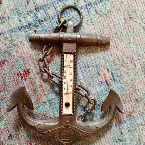 Metallinen seinälämpömittari ankkurin muotoisella rungolla. Lämpömittari näyttää lämpötilan asteikolla, joka on kiinnitetty ankkurin keskiosaan. Yläosassa on rengas ja ketju ripustamista varten. Sopii esimerkiksi sisätilojen tai katettujen tilojen lämpötilan seurantaan ja merihenkiseksi sisustusyksityiskohdaksi.