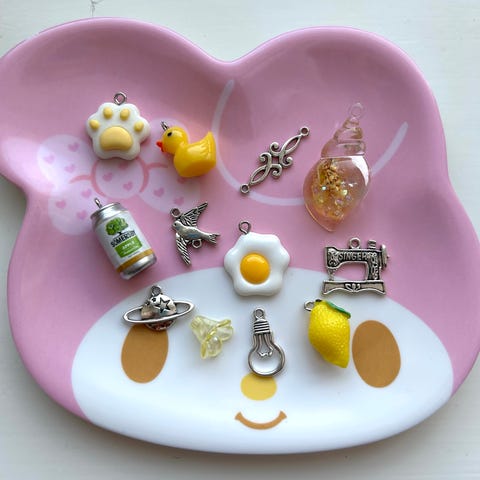 yhden helmen ja 4 connector charmia. kaikki muut uusia paitsi harmaa "karva"pallo, hershey's ja pieni kultainen sydän. materiaaleina korumetalli, muovi ja hartsi. myynnissä myös muita riipuspusseja!!