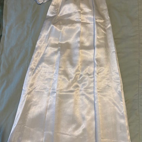 Luonnonvalkoinen, uusi neulottu (villaa?) kastemekko. Huomioithan, että koska mekko on tehty käsityönä, se voi olla joistain kohdista epäsymmetrinen. En ole itse mekkoa tehnyt, vaan ostanut, mutta ei päätynyt koskaan käyttöön.