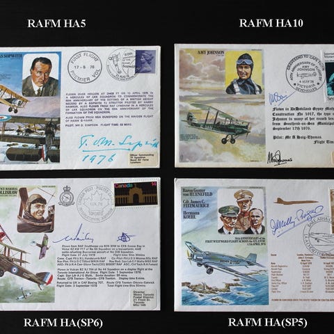 Myyn kuvissa näkyvät Ison-Britannian kuninkaallisten ilmavoimien ilmailumuseon ja kuninkaallisen laivaston filatelistiosaston keräilykuoret 1970- ja 1980-luvuilta. Tässä erässä on edustettuna kuninkaallista väkeä, Luftwaffen FW 200 Condorin pudotus laivan katapultilta laukaistulla Hawker Hurricanella, ilmavoimien hammaslääkäreitä unohtamatta, Etelänavalla USAF Starlifterillä käynyt lentokuori ja ilma-aluksen päällikön nimmarilla oleva Sir Thomas Sopwithin lentokuori. Viidessä kuoressa on ilma-aluksen päällikön/vastaavan nimikirjoitus. Postitan postin/matkahuollon pikkupakettina seurantanumeron kera, joten posti- ja paketointikulut ovat seitsemän euron luokkaa. Samoilla lähetyskuluilla tulee vaikka kaikki myynnissä olevat postimerkit ja kuoret.