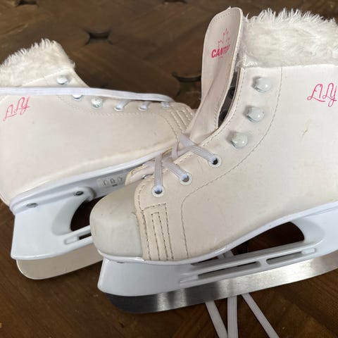 Lasten luistimet / kaunoluistimet, koko 29. Pohjallisen sisämitta 183 mm. Pohjalliset erittäin hyvässä kunnossa. Pieniä naarmuja kärjessä. Valkoiset luistimet, joissa nauhakiinnitys ja turkisreunus varressa. Terissä ei kärkipiikkiä.