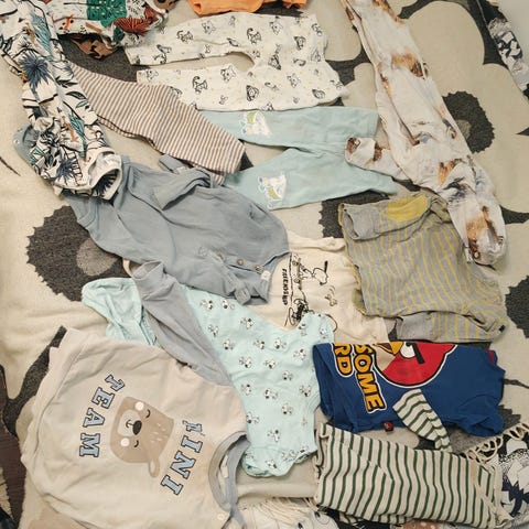 Pojan / unisex vaatteita pakettina, koot 50 ja 80 välillä. Käytetty kunto, pari käyttämätöntäkin.
