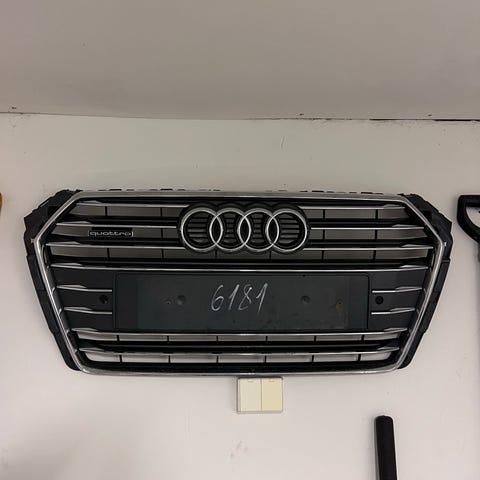 Audi etusäleikkö. Muovinen etumaski, jossa paikka rekisterikilvelle ja kiinnityspaikka Audi-logolle. Väri musta, kromireunus. Säleikössä ja erillisissä ilmanotto-/sumuvalojen ritilöissä näkyy käytön jälkiä ja halkeamia.
