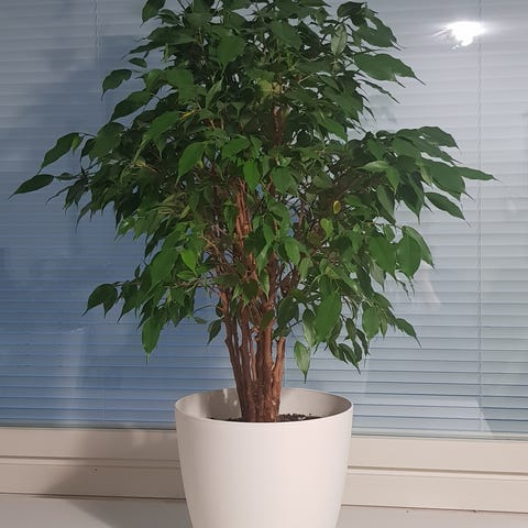 Lähes 90-senttinen lyyraviikuna kaupan istutusruukussa. Nyt olisi aika laittaa tämä oikeaan kasvatusruukkuun ja uusiin multiin, mutta isolle puulle ei enää olekaan olohuoneessa tilaa. Puun aika juurtua uuteen kotiin.