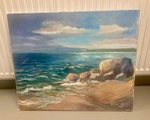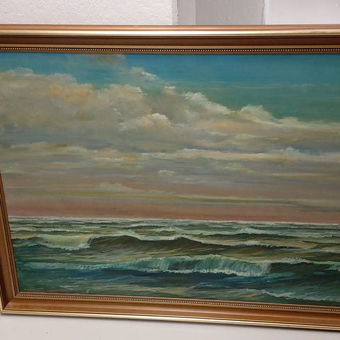 Kehystetty öljyvärimaalaus paneelille/puu, merimaisema. Väinö Timmin maalaus vuodelta 1926. Teoksen takana lukee lyijykynällä kirjoitettuna: Eftermiddags stämning vid kusten av ”Newport på ön Wight”. Målat av W. Timm 1926. Teos on suorakaiteen muotoinen, koko korkeus 54,5 cm ja leveys 94 cm. Maalauksen alakulmassa on taiteilijan signeeraus.