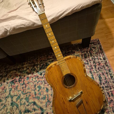 Akustinen kitara dreadnought-mallisella rungolla. Väri on sunburst, ja rungossa on koristeellinen pleksi. Teräskielinen akustinen kitara ylimöörösenä nurkissa on noita rilluttimia sen verran ettei seinille mahdu niin siksi pitää luopua hinta ei kiveen hakattu ja vaihtoja voi ehdottaa sähkökitaroihin.