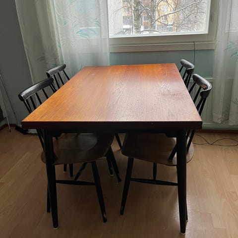 Fanett-ruokailuryhmä neljällä tuolilla. Istuinosat ja pöytälevy tiikkiviilua, jalat ja tuolien selkänojat mustaksi maalatut.